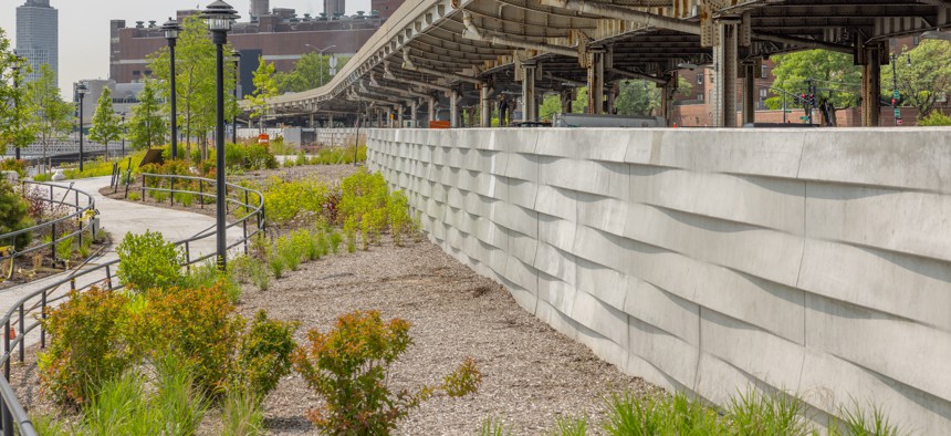 As intentionally designed post-Sandy, the new gates are tucked neatly and inconspicuously inside the belly of pristine playgrounds, sport fields, and berms of the extensive waterside public parks. They hide the deployable mechanical structures that await activation. The public space is now elevated at least ten feet higher than their original contour to contain a rising sea level. The redevelopment includes the floodwalls now featured in the parkland.