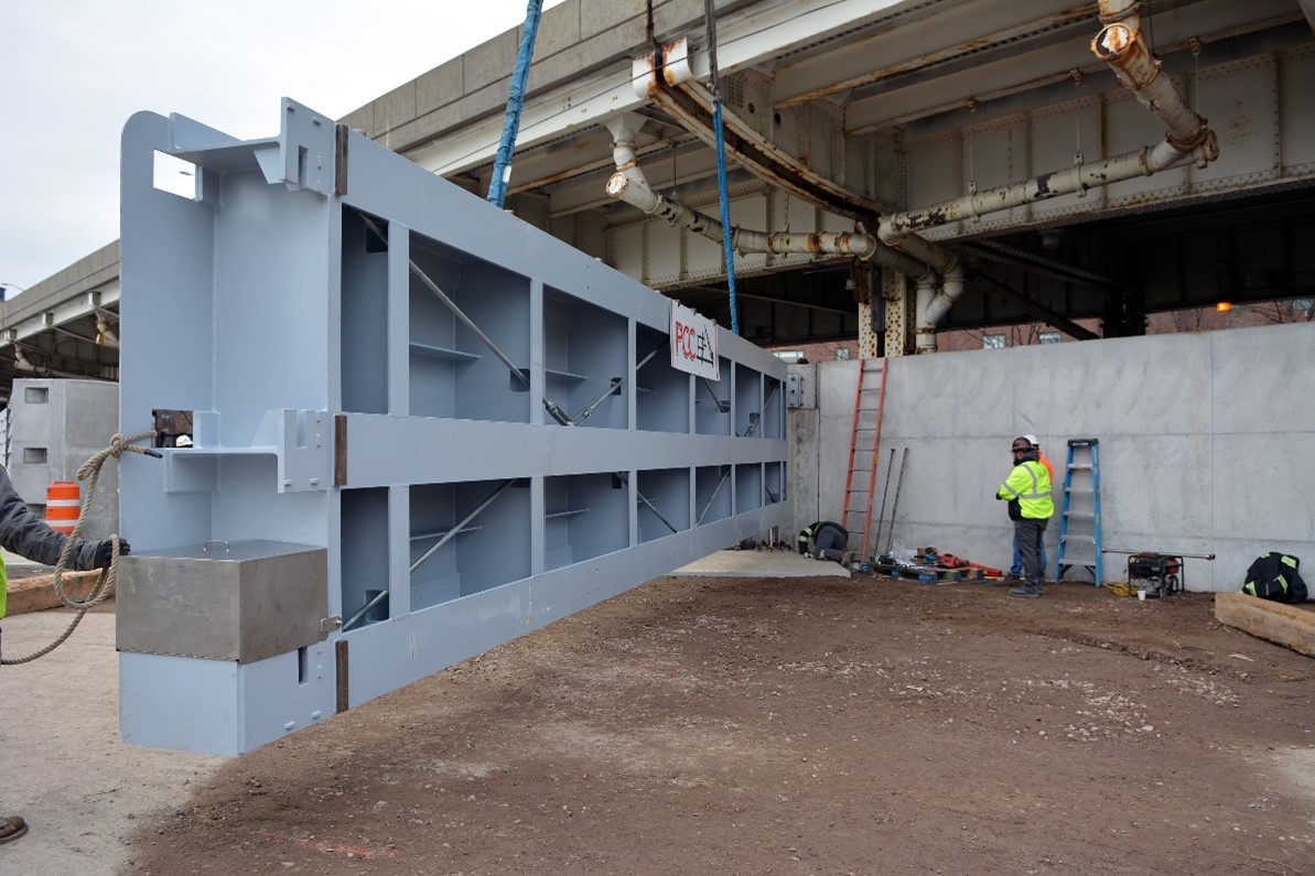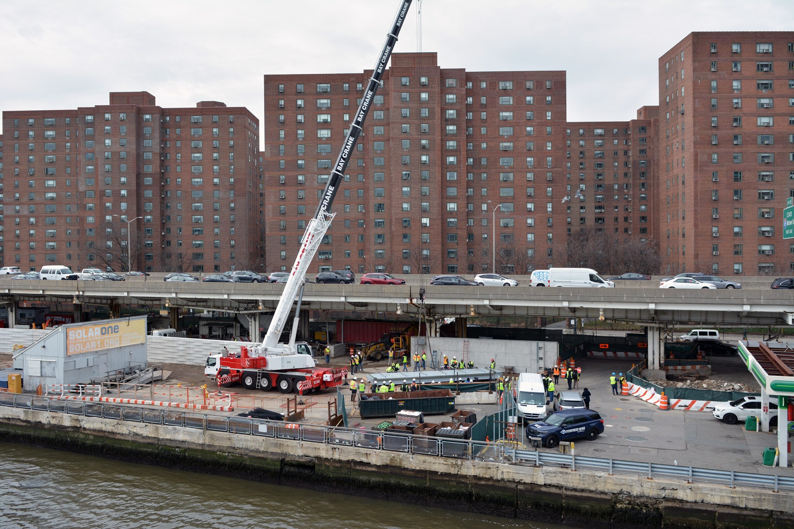 A 197-foot-tall Liebherr LTM 1130 crane prepares to lift the first 32,000-pound flood gate into place as part of East Side Coastal Resiliency
